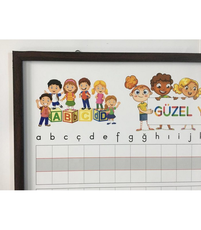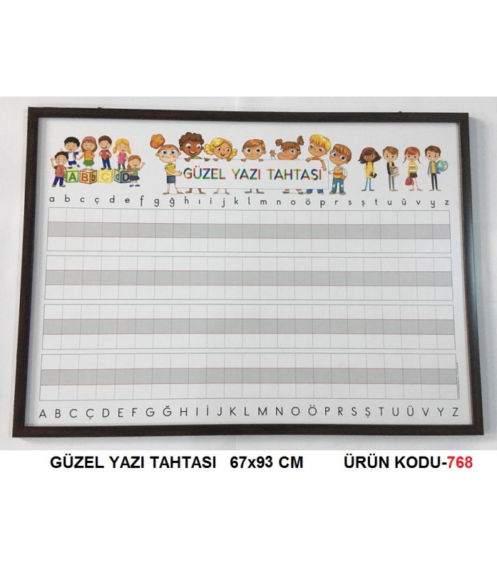 Güzel yazı tahtası (Çizgili) çerçeveli 67x93 cm ebadı olup çizgileri yeni yazma sistemine göre dizayn edilip 4 satırdan oluşmaktadır.Arka zeminde 4 mm mdf(sunta) vardır çabuk deforme olmaz.Öğrencilerin harfleri kolay kavramada okuma ve yazmada çabuk öğrenme kolaylığı sağlamaktadır.Tahtamız kolaylıkla yazılıp silinebilir özelliğine sahiptir.Her sınıfta ve her evde olması gereken eğitim materyalidir.Askı aparatı sayesinde çok rahat duvarınıza asabilirsiniz.