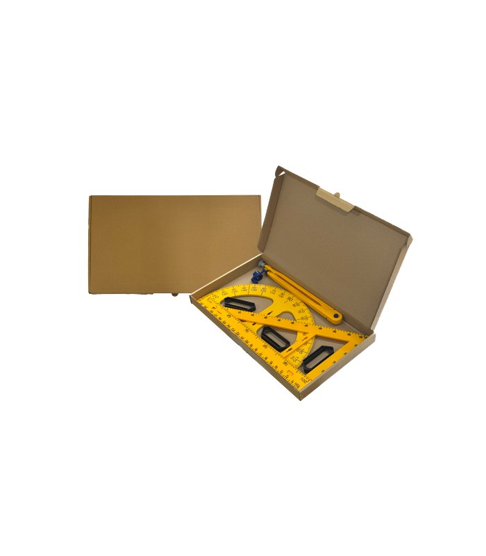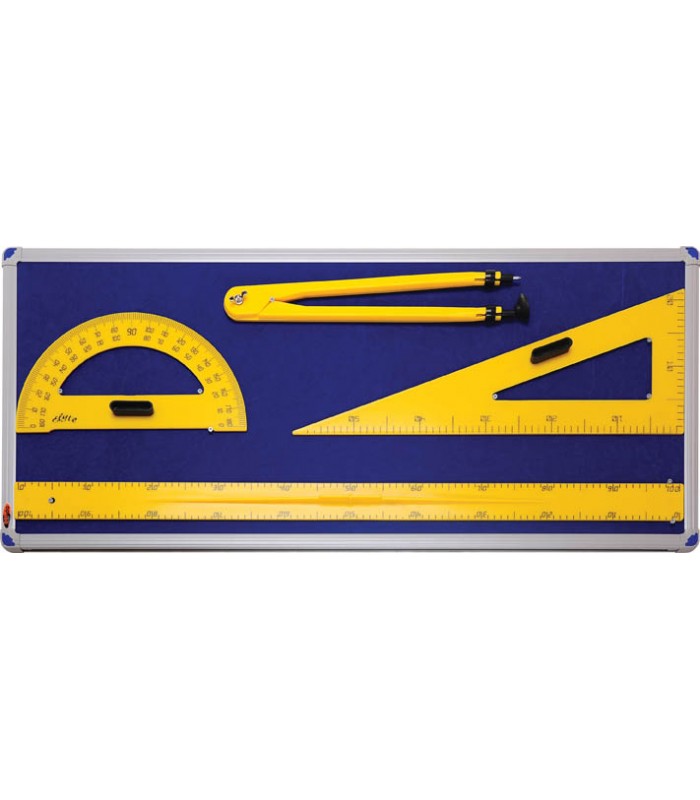 Geometri takımı panolu olup duvara montajı kolaylıkla yapılabilir.Cetvel,iletki, pergel,gönye olmak üzere 4 parça ve panosuyla birlikte 5 parçadan oluşmaktadır.Pano ölçüsü 45x105 cm dir.Pergel hem beyaz yazı tahtası için hemde tebeşirli yazı tahtalarında kolaylıkla kullanılabilir.Yazı tahtası yüzeyine hiç bir zarar vermez.
