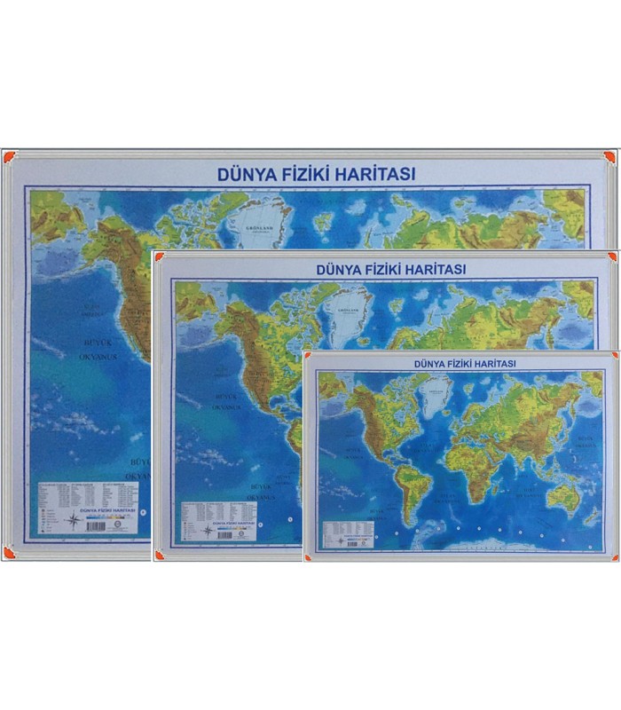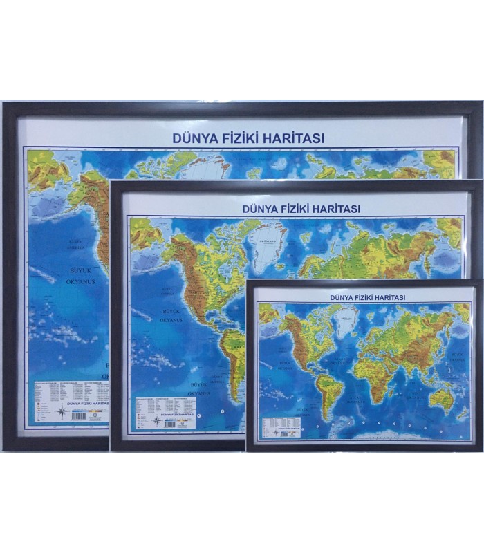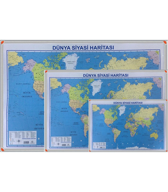 Dünya haritalarımızda 4 boy vardır.100x140 cm,70x100 cm,50x70 cm,35x50 cm.