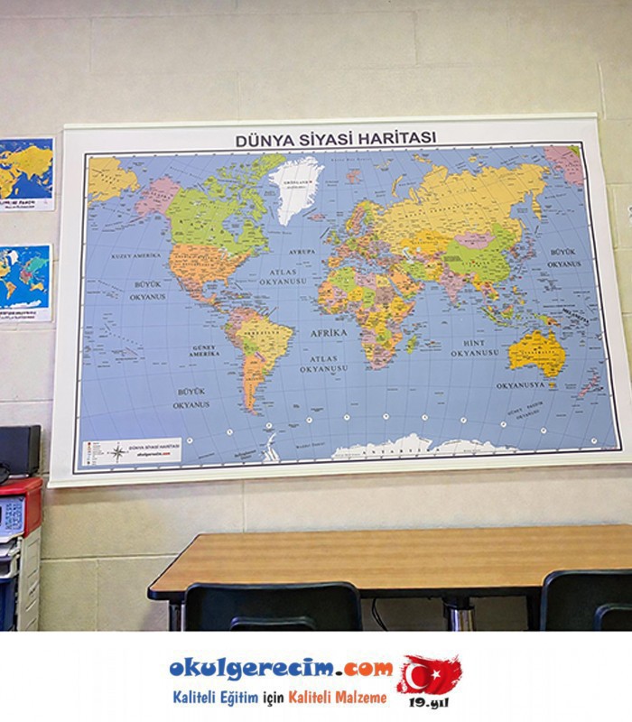 Eğitim kurumlarından ofislere, çalışma alanlarından toplantı odalarına kadar geniş bir kullanım yelpazesi sunan bu Dünya Siyasi Haritası, dayanıklı yapısı ve yüksek baskı kalitesiyle öne çıkıyor. Canlı renkleri ve okunaklı detaylarıyla hem dekoratif hem de işlevsel bir çözüm sunar.